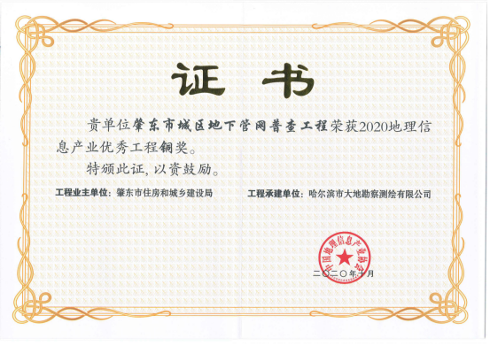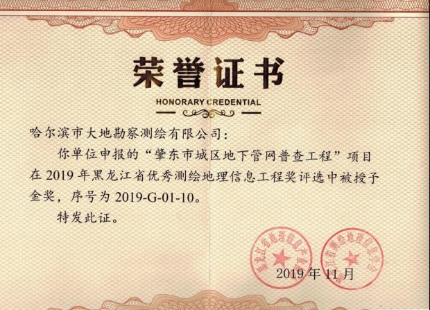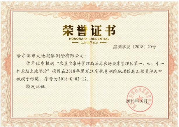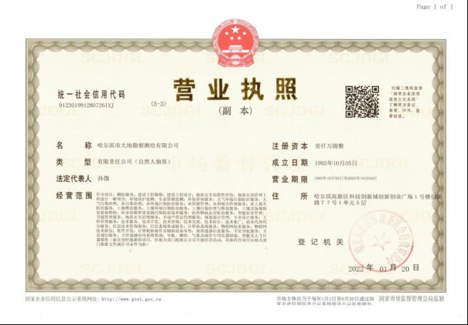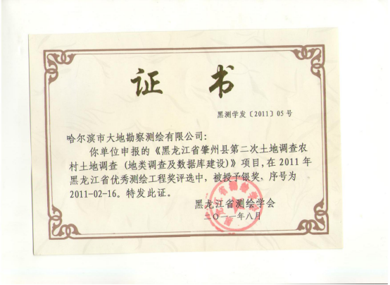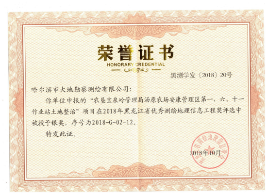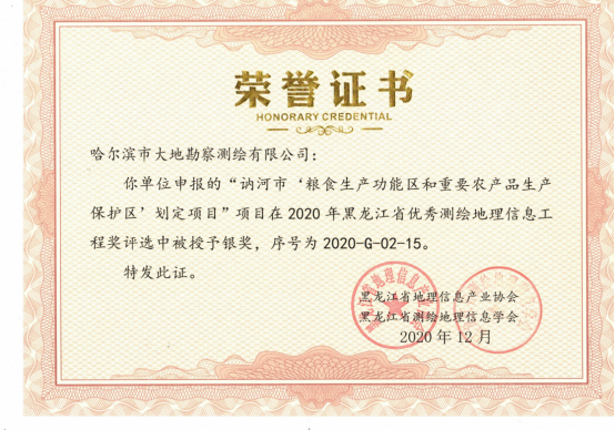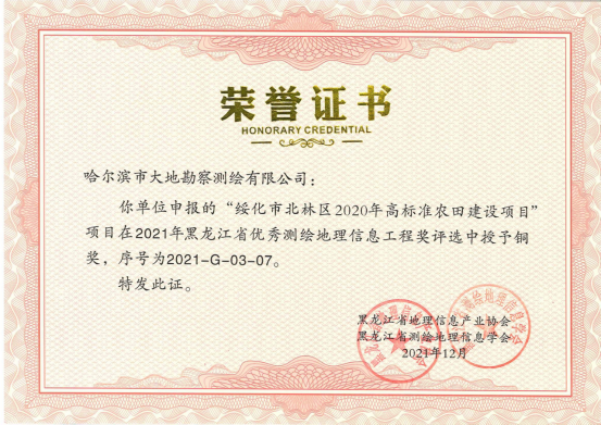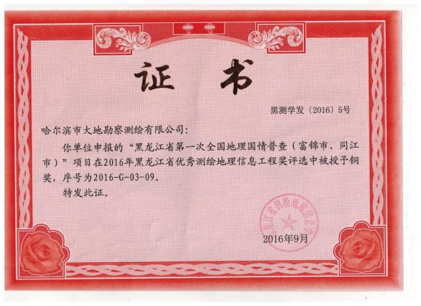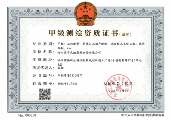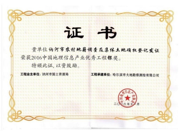 哈尔滨市大地勘察测绘有限公司成立于1993年10月,注册资金1000万元。我公司是一家专业的测绘地理信息高新技术企业,2017年、2018年连续两年被评为中国地理信息产业全国百强企业和TOP高成长企业。是中国卫星导航定位协会常务理事单位、中国地理信息产业协会理事单位、黑龙江省测绘地理信息学会副理事长单位、黑龙江不动产调查与登记代理协会副会长单位。具有国家测绘地理信息局颁发的测绘甲级资质、《黑龙江省基本农田划定》省级资质、《土地规划机构》乙级资质、《土地登记代理》省级资质、《土地利用总体规划修编》省级资质等7项资质。公司通过了ISO9001国际质量体系认证、环境管理体系认证、职业健康安全管理体系认证,荣获企业3A信用等级证书、重合同守信用企业证书、质量服务诚信单位证书。黑龙江省测绘地理信息产业协会诚信单位称号,且荣获多个奖项,其中国家级奖项2个,省级奖项11个。拥有有效专利25件,其中发明专利2件、软件著作权23件,具有雄厚的自主研发创新实力。