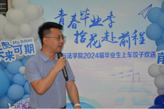 毕业班辅导员王凯在寄语中表达了对2024届毕业生的依依不舍,他表示,离开校园将面临身份与角色的转换,会遇到各种挑战和压力,难免会感到迷茫、焦虑,甚至失望,希望大家耐心一些,踏实前行,所有美好定会不期而遇。