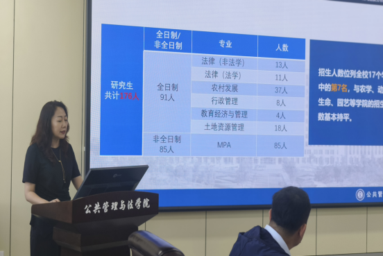 首先,学院副院长程镝教授作2024年学院研究生工作报告。汇报2024年研究生招生及毕业情况,分析研究生工作成绩与不足并对下一步工作进行部署安排。她强调,在全体教师的努力下,学生培养质量逐年提升;学院逐步建立了“普适+奖励”相结合的激励机制;持续加大人才引育力度。她指出,目前研究生培养还存在一些问题,下一步学院要强化研究生培养过程管理;加强研究生学术氛围打造;加快研究生课程建设;不断优化导师管理工作。