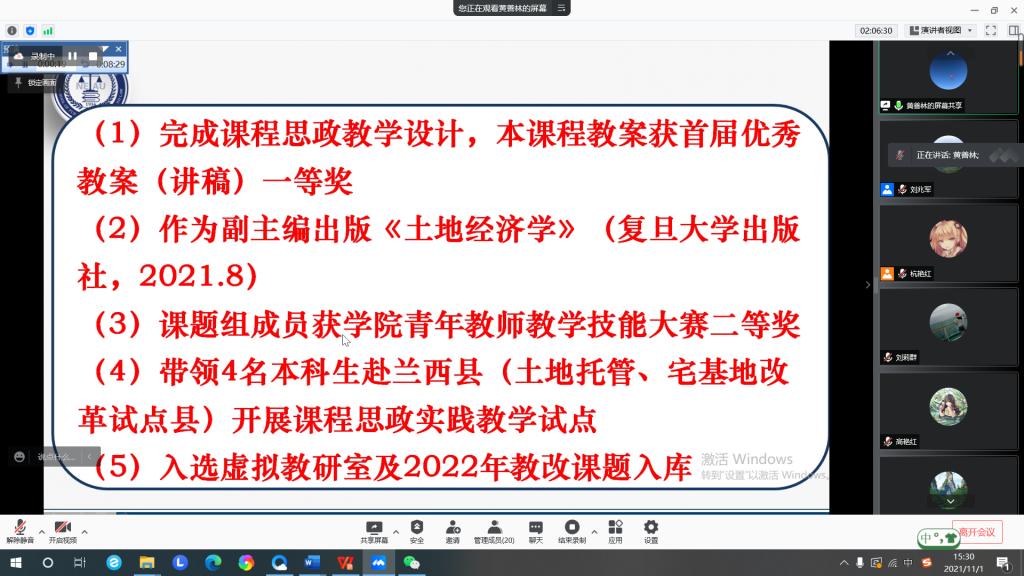 黄善林老师的《土地经济学》立足国情、社情、地情,在土地利用、制度、市场领域融入耕地保护、改革成就等思政要素并总结系列成果,极大增强了学生对制度、专业的自豪感。