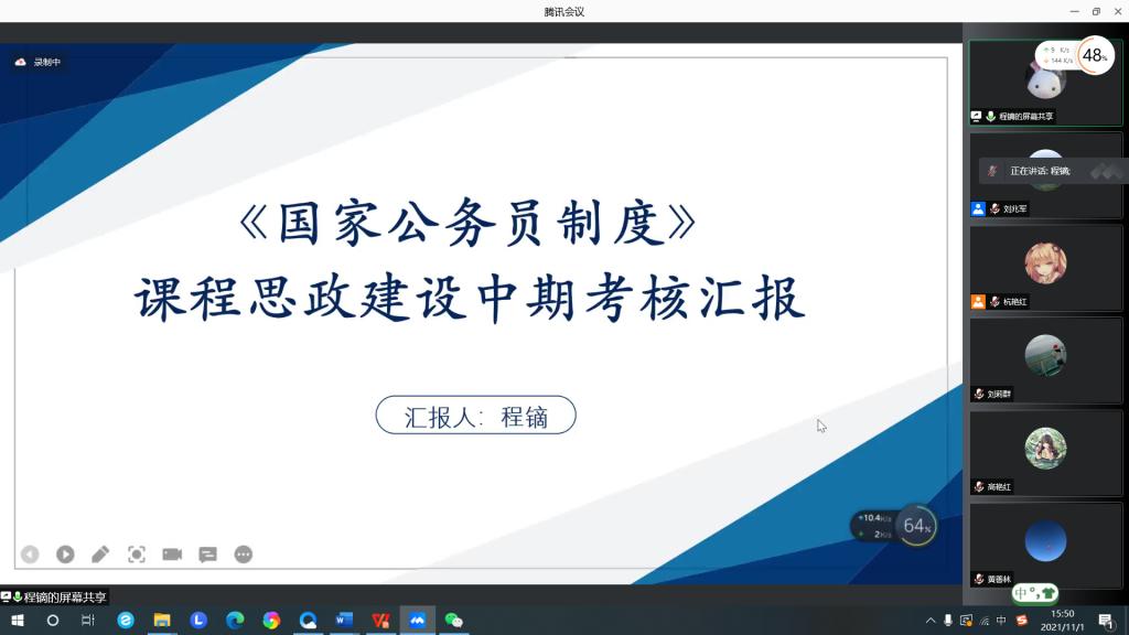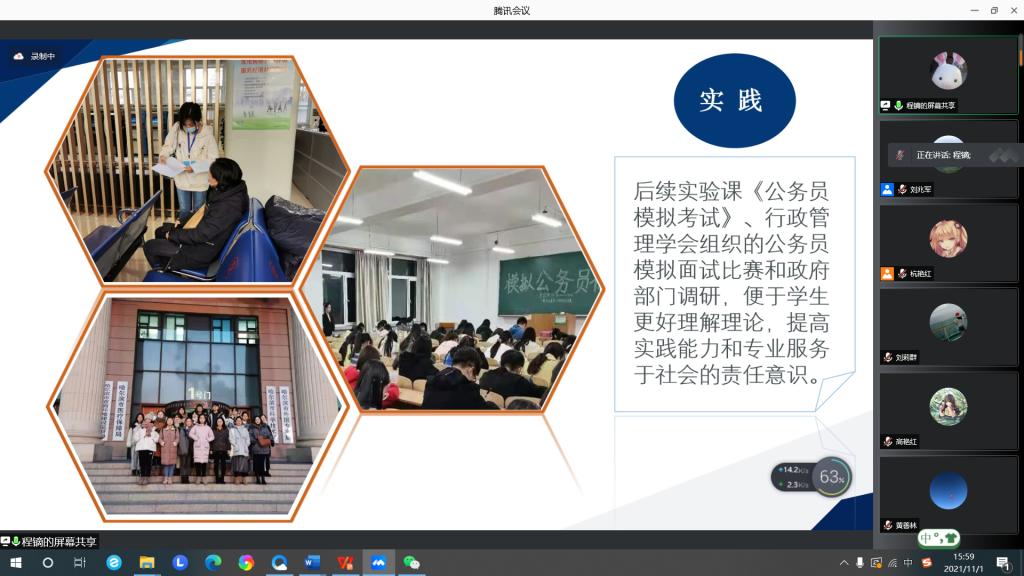 程镝老师的《国家公务员制度》以“学”“教”“思”“行”为载体,在课程、实践中深挖课程资源,并以丰富的社会调查和实战拓展思政育人平台,引导学生明理知法并树立正确的义利观。
