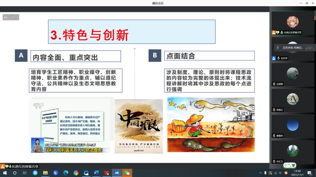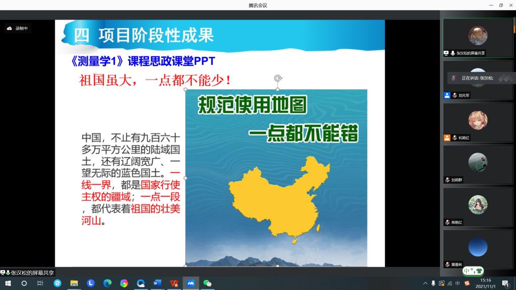 会议中,来自城乡规划、法学、行政管理、土地资源管理、社会工作、土地整治工程6个专业的12位课程思政项目负责人结合具体工作,对承担的课程思政建设理念、内容、案例、方法、成效、问题、改进等方面进行详细介绍,分享交流了12门课程思政的阶段成果,特别是在增强学生家国情怀、专业认同、职业精神,提升理论认知与实践动手能力等方面开展了特色探索,取得了积极效果,引发与会教师的共鸣和积极评价: