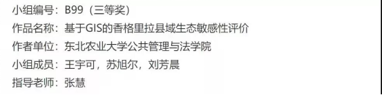 我院张慧老师指导学生小组在2021地理设计比赛中,以《基于GIS的香格里拉县域生态敏感性评价》作品荣获全国三等奖。(源自《2021地理设计组获奖名单,》链接:https://contest.geoscene.cn/detail/110)