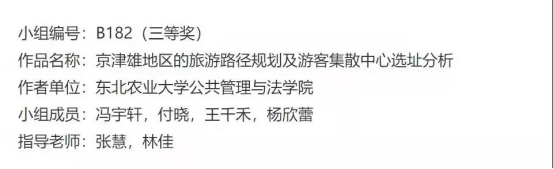 我院张慧老师、林佳老师指导学生小组在2021地理设计比赛,以《京津雄地区的旅游路径规划及游客集散中心选址分析》作品荣获全国三等奖。(源自《2021地理设计组获奖名单》,链接:https://contest.geoscene.cn/detail/110)