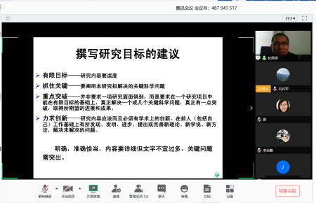 本次会议利用腾讯会议平台、以线上论证交流的方式进行,院长杜国明、评议专家和全体申报教师共同参加,由副院长刘兆军主持。会议中,杜国明院长对申报书撰写、评审等方面的要点进行详细讲解;10余位申报教师全面介绍了本人的申报内容;杜院长和宁静、刘焕军、李全峰等评议专家针对申报中的问题逐一提出详细的修改建议,并为首次申报的青年教师提供全程指导。整个线上评议过程紧凑有序,各位老师的讨论热烈。