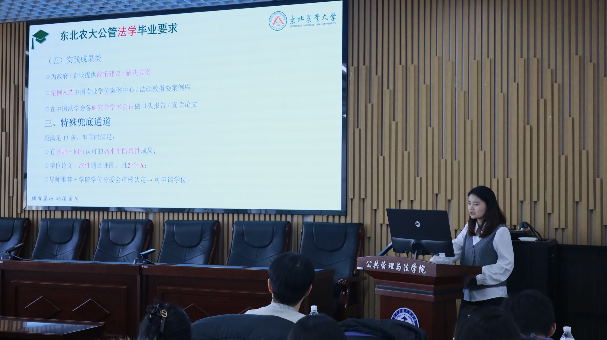 廖燕同学结合法律专业特色,对照研究生培养相关政策新旧变化,对学院最新研究生毕业要求进行逐条细致解读,精准填补了学生在政策认知上的信息盲区,让大家清晰掌握毕业考核的各项标准。同时,她系统梳理了法律领域各类学科竞赛的参赛条件、评选规则、时间节点等关键信息,详细讲解参赛流程与备考要点,引导同学们主动参与赛事实践,在实战中锤炼专业技能、涵养法学素养。