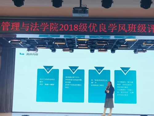 本次评比大会按照人文地理与城乡规划、土地资源管理、法学类、行政管理、土地整治工程专业的先后顺序进行,由2018级各班级班长根据本班2018-2019学年在班级管理、思想政治、学风建设、组织纪律、社会实践等方面的表现进行展示。每个班级都积极参加,精心准备了PPT和视频,将一年的建设成果生动地呈现在大家面前,全面地展现班级风采,诠释了班级文化,同时展现了东农学子积极向上的精神面貌,表达了公法学子勤于进取、勇于前行、坚持做好学风建设的决心。