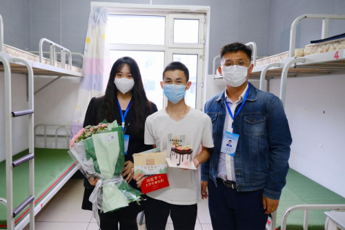 在迎新的首日,学校与学院的各位领导老师们一名过生日的心声送上精心准备的蛋糕、花束与书籍,并送上满满的生日祝福,在他来校第一天,就感受到来自学校以及学院的温暖。