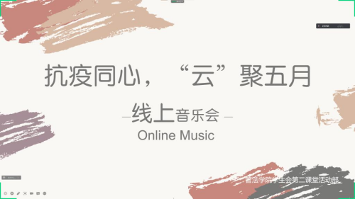 为进一步丰富学生的校园文化生活,在全面落实防疫政策的基础上,学院学生会于5月1日利用腾讯会议举办“抗疫同心,云聚五月”线上音乐会,旨在用歌声凝聚管法力量,帮助学生缓解疫情生活中的疲惫与不安。音乐会伊始,精彩的节目、悠扬悦耳的歌声将线上音乐会推向了高潮。在音乐会中,进行了多轮互动环节,抽取幸运观众给予惊喜小礼品,带动了直播间的氛围。疫情于此,抗疫同心,线上音乐会圆满举行,体现了管法学子积极乐观的心态,展现了管法学子的青春风采。