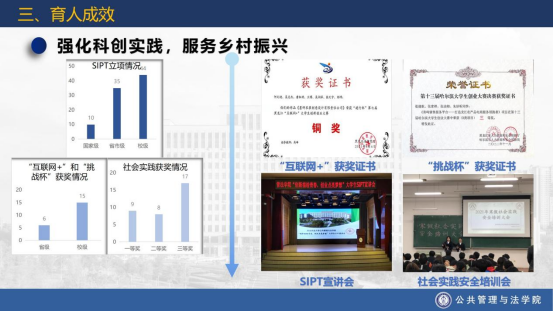 3、强化科创实践,服务乡村振兴。学院发挥专业学科优势,积极推进科技创新工作,三年来完成SIPT国家级立项10项,省级立项35项,校级立项44项。在“互联网+”和“挑战杯”比赛中,累计获得省级奖6项、校级奖项15项。在社会实践评比中,198支团队成功立项,获校一等奖9项、二等奖8项、三等奖17项。