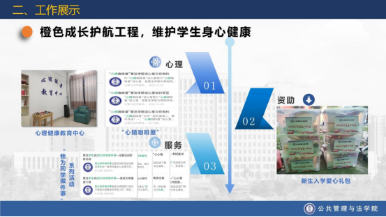 春风育人化绸缪,雨润无声为人梯。学院坚持心育与德育相结合,搭建心理育人平台,深化资助育人体系,完善服务育人机制,形成了“心理、资助、服务”三位一体橙色育人格局,践行用细心关怀学生,用耐心解决困难,用恒心促进提升,塑造学生成长成才护航工程。