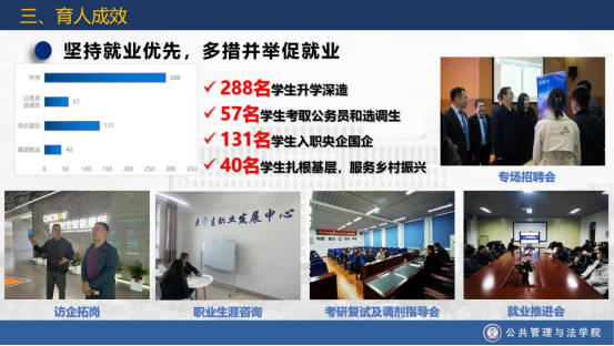 4、坚持就业优先,多措并举促就业。学院不断优化就业工作机制,成立“大学生职业发展中心”,大力推进“访企拓岗”专项行动,通过举办学院专场招聘会,大力建设“实习基地”等切实有效的“稳就业”、“保就业”措施,学院就业率连续多年提升,多次获得校就业工作提升一等奖,多名辅导员获得就业先进个人荣誉称号,三年来288名同学升学深造,57名同学考取公务员和选调生,131名同学入职央企国企,40名同学扎根基层,服务乡村振兴。