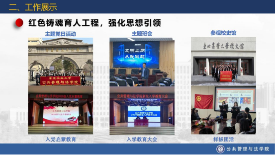 学院聚焦思政教育主旋律,搭建思政育人平台,将“为党育人,为国育才”重要使命融入日常工作,以“理想信念教育”和“爱国主义教育”为核心,紧扣党建引领总要求,筑牢党团共建支撑点,夯实理论学习主阵地,发挥网络思政新动能,打造红色铸魂育人工程,培育能够担当民族复兴大任的时代新人。