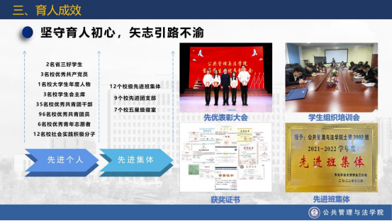 1、坚守育人初心,矢志引路不渝。学院依托红色铸魂育人工程,三年来累计培养出2名省三好学生,3名校优秀共产党员,1名校大学生年度人物,3名校学生会主席,35名校优秀共青团干部、96名校优秀共青团员、6名校优秀青年志愿者、12名校社会实践积极分子、12个校级先进班集体、9个校先进团支部、7个校五星级寝室。