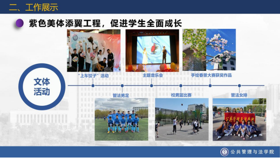 学院以第二课堂为主阵地,将理想信念教育与体育、美育相结合,以体树人、以美育人,不断拓展育人载体,创新育人形式,优化育人内容,积极营造“健康生活、热爱生活”的紫色育人氛围,做到体育强人心、美育化人心、思政进人心,推进美体育人与思政工作并举融通,促进学生全面成长。