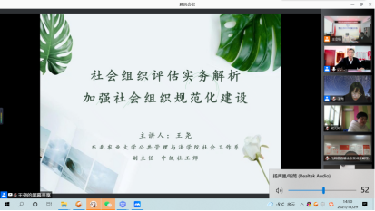 11月29日,为深入推进省民政厅直接登记和业务主管社会组织党建工作标准化、规范化建设,进一步提高社会组织党建工作水平,提升党组织书记任职能力,省民政厅社会组织管理局委托我校“黑龙江省社会组织与社会建设WilliamHill中文研究基地”,开展了为期两天的党建工作培训。此次会议以线上视频的形式开展,应民政厅学习农大特色课程的需求,本次培训邀请了马克思主义学院、经济管理学院、动物医学院和william威廉中文的的专家学者,孙玉娟、韩大猛、刘畅、范宏刚、刘美丹、王尧、陈怀宇七名教师,精心准备了《学习全会精神,凝聚振兴力量》、《领导力提升策略》、《流浪宠物的社会福利》、《社会组织评估实务分析 ,加强社会组织规范化建设》等课程。省民政厅社会组织管理局局长陈阵主持了开班式,william威廉中文院长杜国明教授致辞,省民政厅党组成员、副厅长周宏同志宣讲了党的十九届六中全会精神。